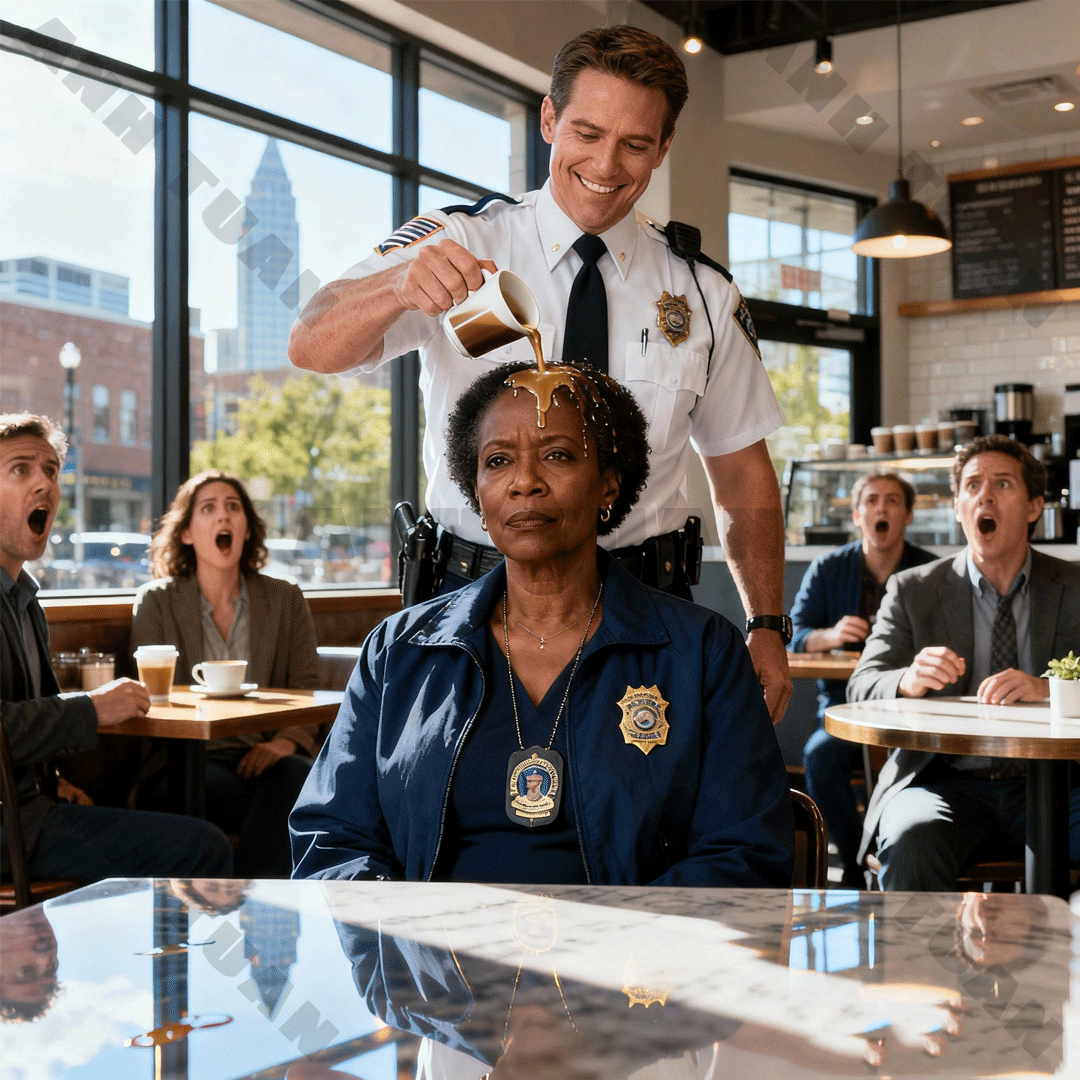 As she reached for her cup, a uniformed police officer deliberately bumped into her. Hot coffee spilled across the counter, splashing onto her hand and staining the sleeve of her suit. Drops glistened on the polished tiles like tiny shards of glass. The café seemed to freeze, the tension in the air sharp enough to be felt in every pulse of silence.