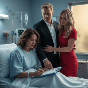 The steady beeping of hospital machines echoed through the white, sterile room. Sarah Mitchell lay on the bed, pale and weak, her body drained from the painful childbirth just hours before. The baby she had dreamed of holding had entered the world silently, gone before she could even say hello. Her eyes were hollow, her soul carved by grief. Beside her, Daniel, her husband, stood perfect in a tailored suit, holding a pen and a stack of papers.