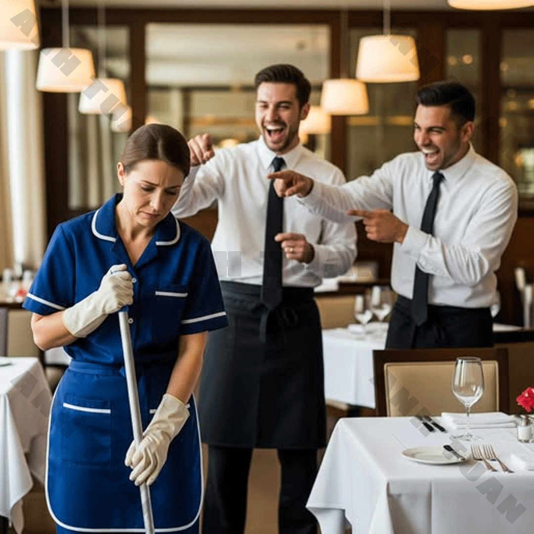 “Hurry up, ‘Boss’!” One waiter jeered, emphasizing the word Boss with full sarcasm. “A customer spilled it, but the manager has to take responsibility, right, old lady?”