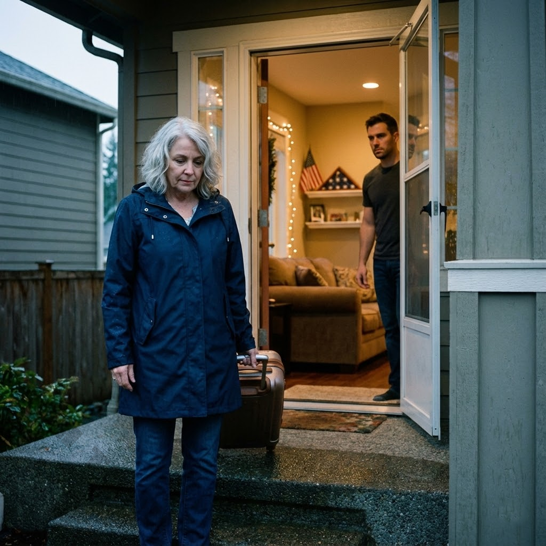 He stepped forward, forcing me to step back onto the porch. His body blocked the doorway like a barrier. “Mom, go home. We’ll talk later.”