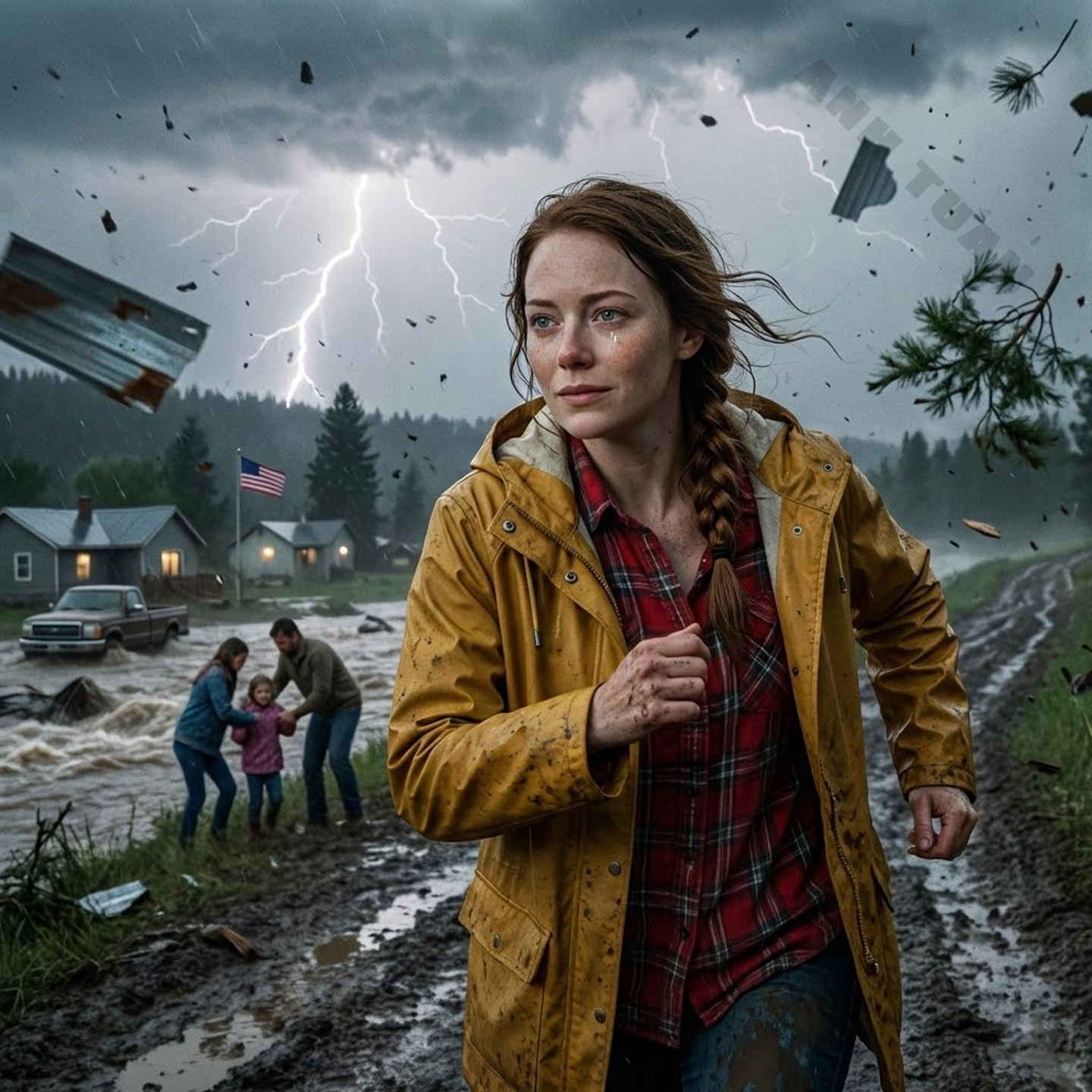 The first gusts came hard enough to make the town’s few tall trees twist. Dust rose in angry spirals, then rain slammed down so fast it turned that dust into mud in minutes. Lightning cut the air every few seconds, turning the world into a strobe of terror.