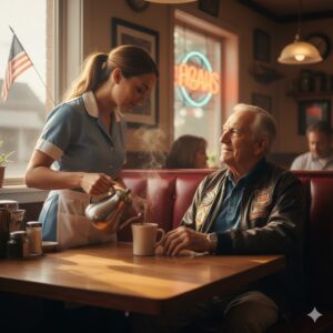 The old man’s voice was soft, almost apologetic, as he settled into his usual corner booth at Rosy’s Diner, the kind of narrow, chrome-trimmed place that still smelled faintly of bacon grease and fresh coffee no matter how many decades passed. His hands trembled slightly as he unfolded the newspaper, more ritual than reading these days, the familiar rustle of paper offering comfort even when the words blurred together. Outside the wide front window, Main Street stirred awake with delivery trucks, a passing school bus, the slow rhythm of a small American town beginning another ordinary morning.