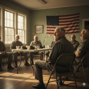 In the early 1930s, a small veterans’ hall opened near the edge of town. It wasn’t much—wooden chairs, coffee that tasted faintly of metal, a potbellied stove that hissed and clicked in winter—but it became a refuge. Men came not to be brave, but to be understood without explanation. They spoke in fragments, letting stories surface when they were ready.