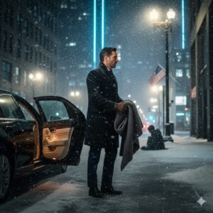 The lobby lights reflected off polished marble and chrome, framing his silhouette the way financial magazines loved to photograph him — tall, composed, untouchable. His charcoal coat was tailored to precision. His gloves were Italian leather. His breath fogged faintly as the doors sealed behind him.