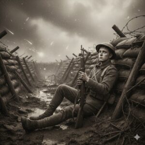 The morning broke over the Western Front with a gray, oppressive fog that seemed almost alive, curling through the shattered trenches and clinging to the mud-soaked earth. Private Reynolds rubbed the frost from his eyes and listened. The BOOM… WHISTLE… THUD… was already beginning, distant but insistent, a relentless pulse that set the rhythm of life here. No one spoke much; there was no point. Every man’s mind was already calculating trajectories, anticipating explosions, listening for that lethal whistle that would announce the next barrage.